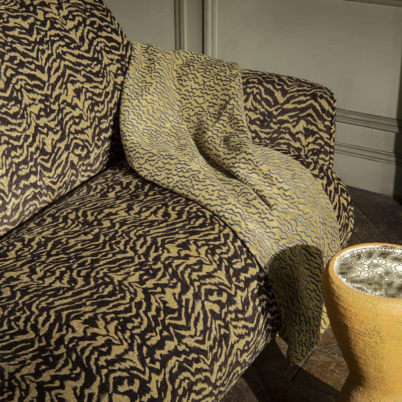* Zébreau est un sublime jacquard de chenille à la main douce et souple. Le motif animalier zébré est représenté ici à petite échelle, ce qui évoque davantage le petit du zèbre, le zébreau.. Tissu réversible. Prévoir une confection adaptée pour renforcer les coutures. Se patine à l'usage.