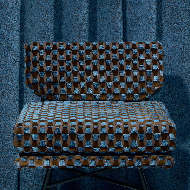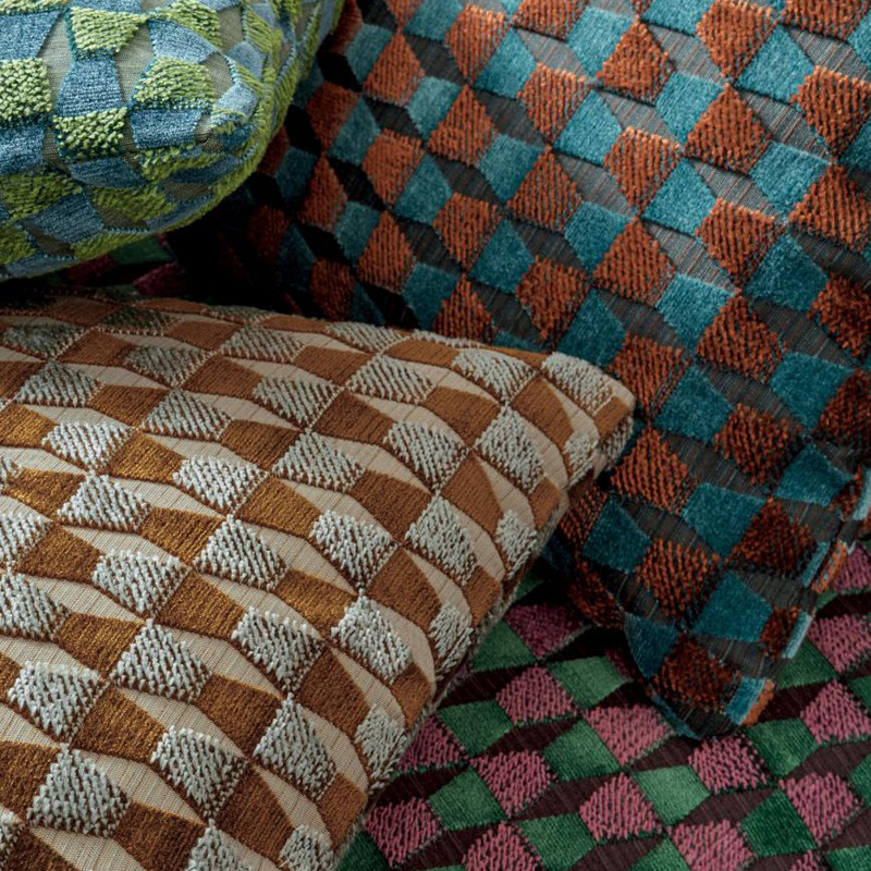 * Fortunato est un précieux velours jacquard. Sur un fond de coton, une composition dynamique de trapèzes de poil rasé, alternent avec des trapèzes aux touffes de poil plus haut. Le résultat donne un effet changeant et vibrant qui rappelle les œuvres de l’artiste futuriste Fortunato Depero. Le poil, de deux hauteurs différentes et réalisé avec deux types de viscose (une plus opaque et une plus brillante), se qui crée une tridimensionnalité marquée qui se développe sur trois niveaux: le fond, le poil coupé et les “cils” du poil haut (en viscose brillante). Fortunato présente un dynamisme marqué également au niveau chromatique. Adapté pour un emploi fréquen